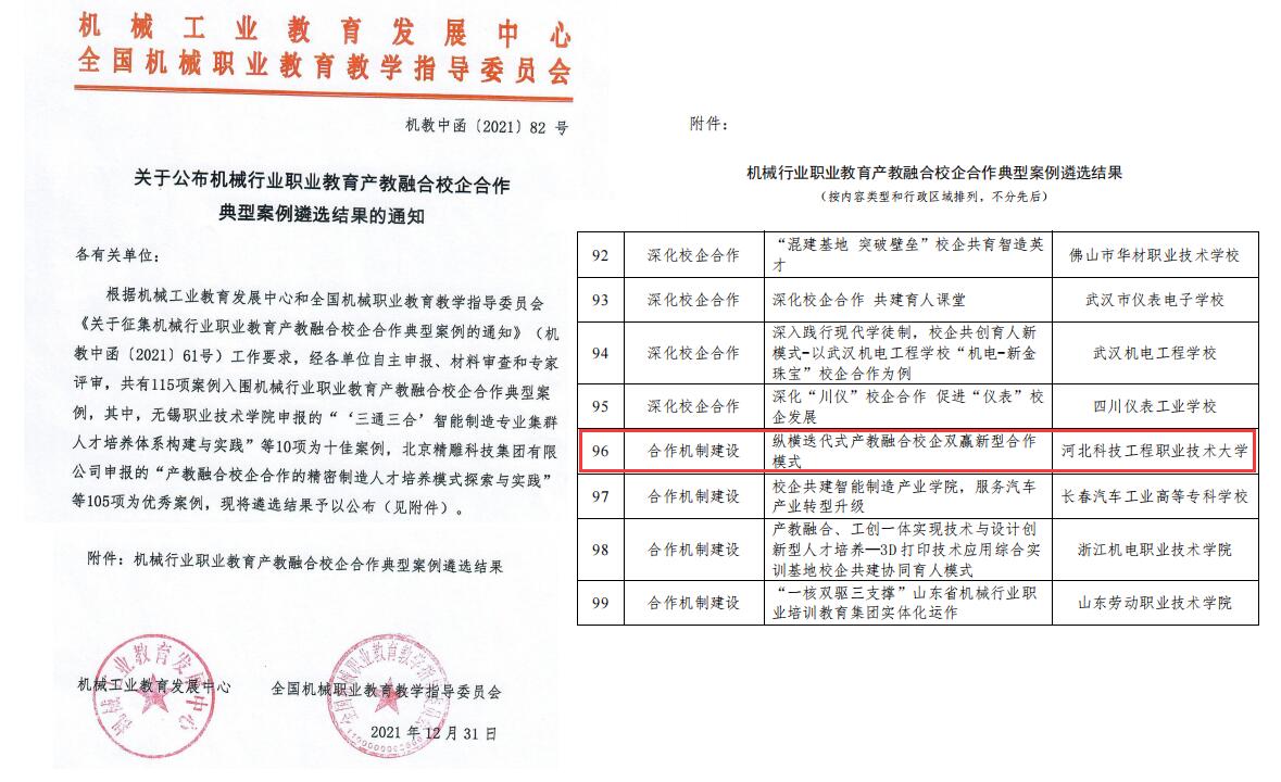 近日,由机械工业教育发展中心和全国机械职业教育教学指导委员会组织的“机械行业职业教育产教融合校企合作典型案例”遴选活动结果公布,365官网机电工程系报送的“纵横迭代式产教融合校企双赢新型合作模式”成功入选优秀案例名单。