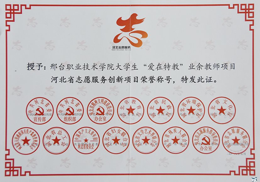 日前,我院大学生“爱在特教”业余教师项目获得“河北省志愿服务创新项目”荣誉称号。