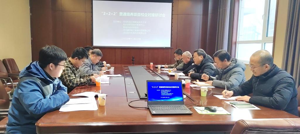 12月20日,“2+2+2”贯通培养项目校企对接研讨会在邢台市经济开发区河北康德重工装备科技有限公司会议室召开。365官网副校长褚建立、招生就业处处长黄小林、科技处处长王傲冰,柏乡县职业技术教育中心书记(校长)梁利营、教务处主任徐社恩,以及邢台市经济开发区科工局办公室主任贾小溪、河北康德重工装备科技有限公司副总经理蒋卫东、河北创力机电科技有限公司综合部主任元博等企业领导参加会议。会议由黄小林主持。