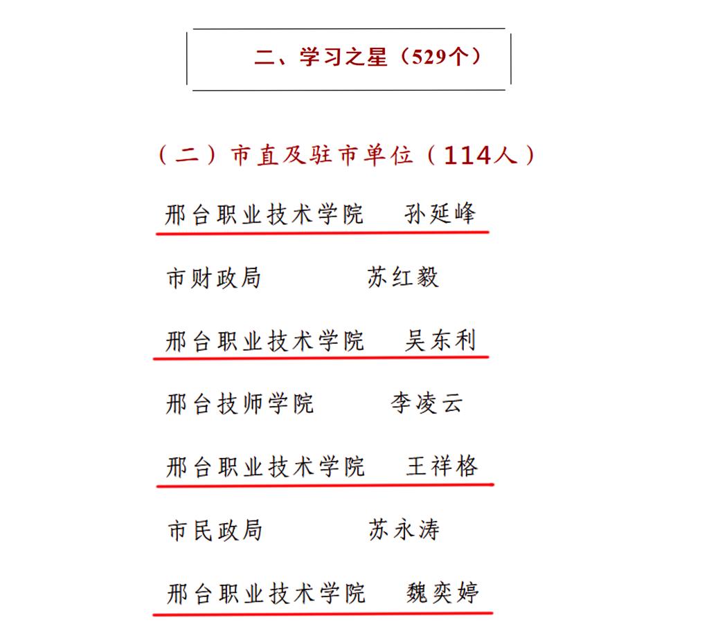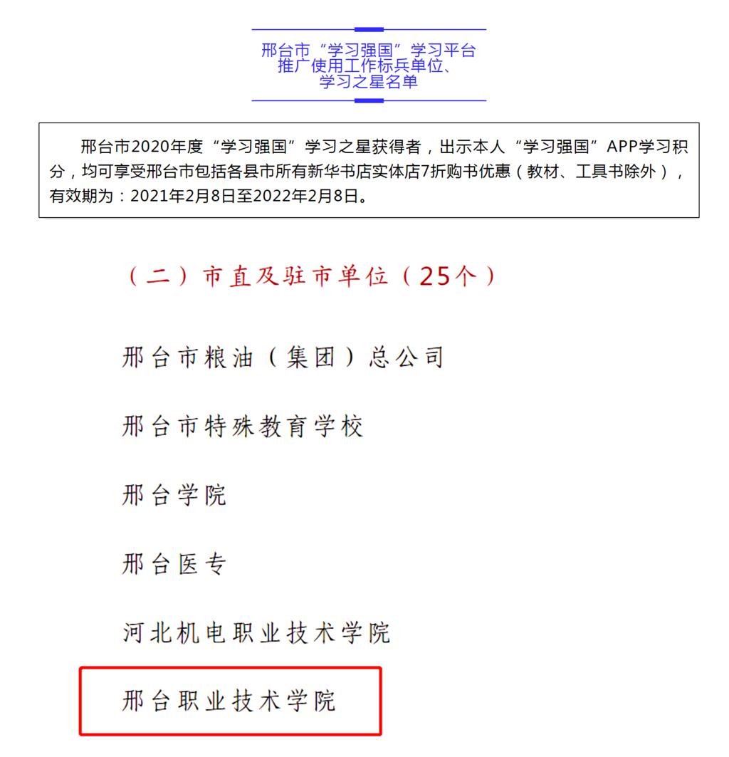 2月7日,市委宣传部对全市“学习强国”学习平台推广使用工作标兵单位、学习之星进行通报。经各地各单位逐级推荐、业务部门审核把关,我院荣获邢台市2020年度“学习强国”学习平台推广使用工作标兵单位,孙延峰、吴东利、王祥格、魏奕婷四名同志被授予学习强国“学习之星”荣誉称号。