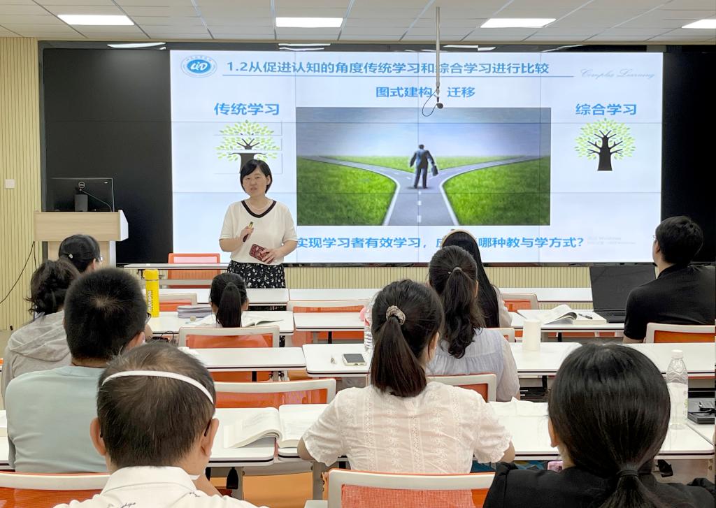 培训采用线上和线下相结合、“全程伴随式”的学习方式。线上学习阶段从7月15日开始,参培教师登录全国高校教师网络培训中心网站,自主学习网课,预做教学设计任务书;线下培训阶段从8月15日开始,围绕“抉择教与学方式、确定现实任务、设计学习任务类别、确定组成技能、设计学习任务、提取与组织学习内容、选定教学策略”7个主题展开,每个主题安排3次培训,参加培训教师经集中学习、完成任务书、展示反馈再完善,最终完成主讲课程的教学再设计任务。