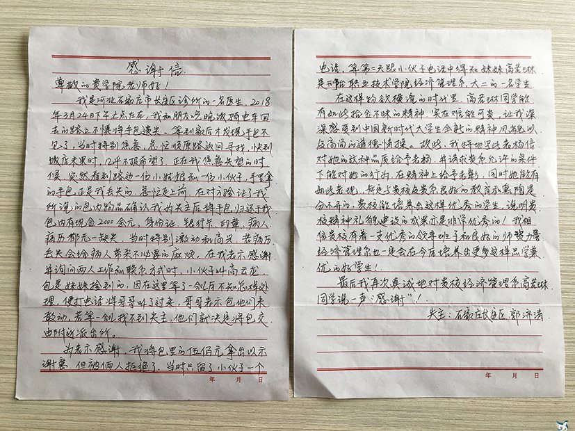 3月24日晚七点经济管理系大二学生高若琳同学,在石家庄市长安区无意间看到路上有个被遗落的手包。她捡起手包后担心失主返回寻找时找不到,便取消了原来的出行计划。当发现手包内除了装有若干随身物品、身份证件、病人病例、还有金额两千余元时,她将哥哥高云龙叫来。随后,他们等到了焦急赶来的失主,在认真核对手包内的物品确认无误后,两位同学将手包还给他。手包失而复得,失主郭济清当场拿出五百元现金塞到他们手中,但二人都没有接受,并在失主一再追问下才告知了学校名字和自己的姓名。失主随后向学院写了感谢信,对高若琳同学和学院给予了高度评价,并将一面“拾金不昧,雷锋精神”的锦旗一同邮寄到系部老师手中。