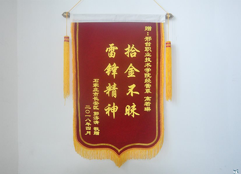 近日,我院经济管理系收到来自石家庄的一封感谢信和一面“拾金不昧,雷锋精神”的锦旗,感谢信中特别对高若琳同学拾金不昧的事迹提出表扬。