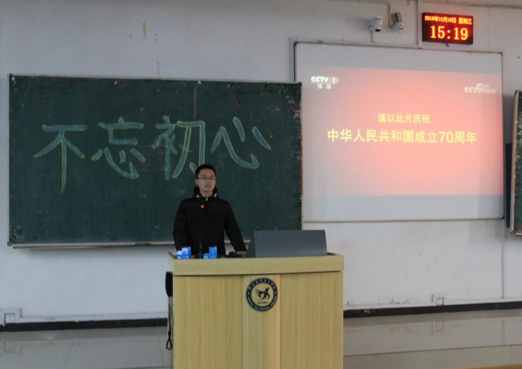 利用网络平台和日常空余时间,组织广大师生在教研室、在宿舍观看“伟大历程 辉煌成就——庆祝中华人民共和国成立70周年大型成就展”网上展馆,感受祖国70年的伟大成就。12月18日下午组织2019级全体学生观看专题片《我们走在大路上》,并撰写观后感分享心得体会。结合“不忘初心、牢记使命”主题教育,组织召开“青春告白祖国”专题班会,进一步加深爱党爱国爱人民的教育。