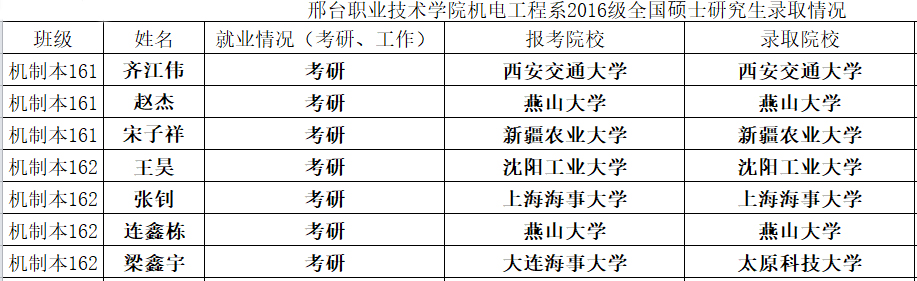 2020年硕士研究生录取工作落下帷幕,在学院及机电工程系全体师生的共同努力下,机电工程系本科毕业生硕士研究生过线率与录取率均取得重大突破。机电工程系2020届本科毕业生共50人,其中24人参加硕士研究生考试,13人通过国家分数线,过线率超过50%,7人被成功录取,其中机制161本的齐江伟同学以400分的高分考入西安交通大学。