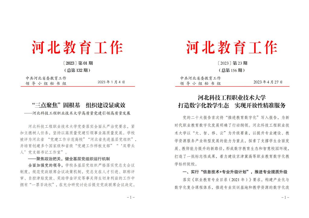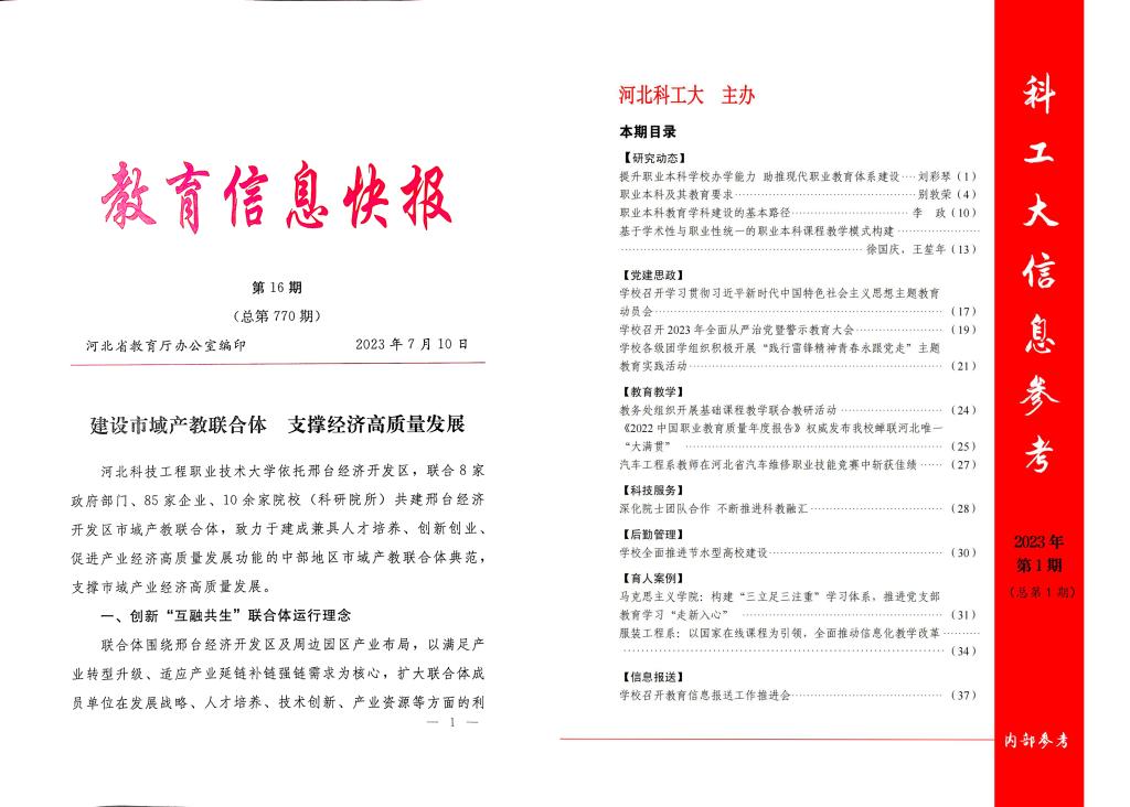 近日,河北省教育厅《教育信息快报》2023年第16期全文刊发了365官网报送的《建设市域产教联合体,支撑经济高质量发展》稿件,这是今年以来继《河北教育工作》《高教参考》等教育内参刊发365官网稿件的第4篇,学校信息报送工作在全省高校信息报送排名中实现了大幅提高,有力提升了学校的知名度与美誉度。