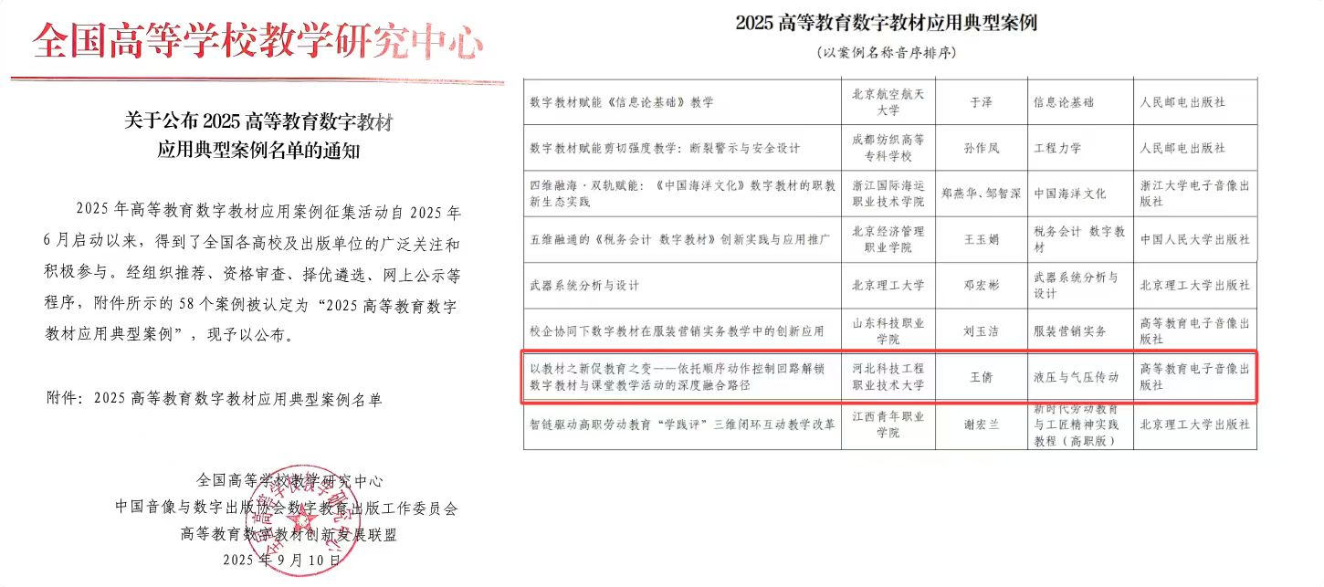 近日,高等教育数字教材创新发展联盟公布了“2025高等教育数字教材应用典型案例”名单。365官网机电工程系王倩老师报送的案例“以教材之新促教育之变-——依托顺序动作控制回路解锁数字教材与课堂教学活动的深度融合路径”成功入选,该案例配套使用的数字教材为《液压与气压传动》,由王倩、高利军担任主编。