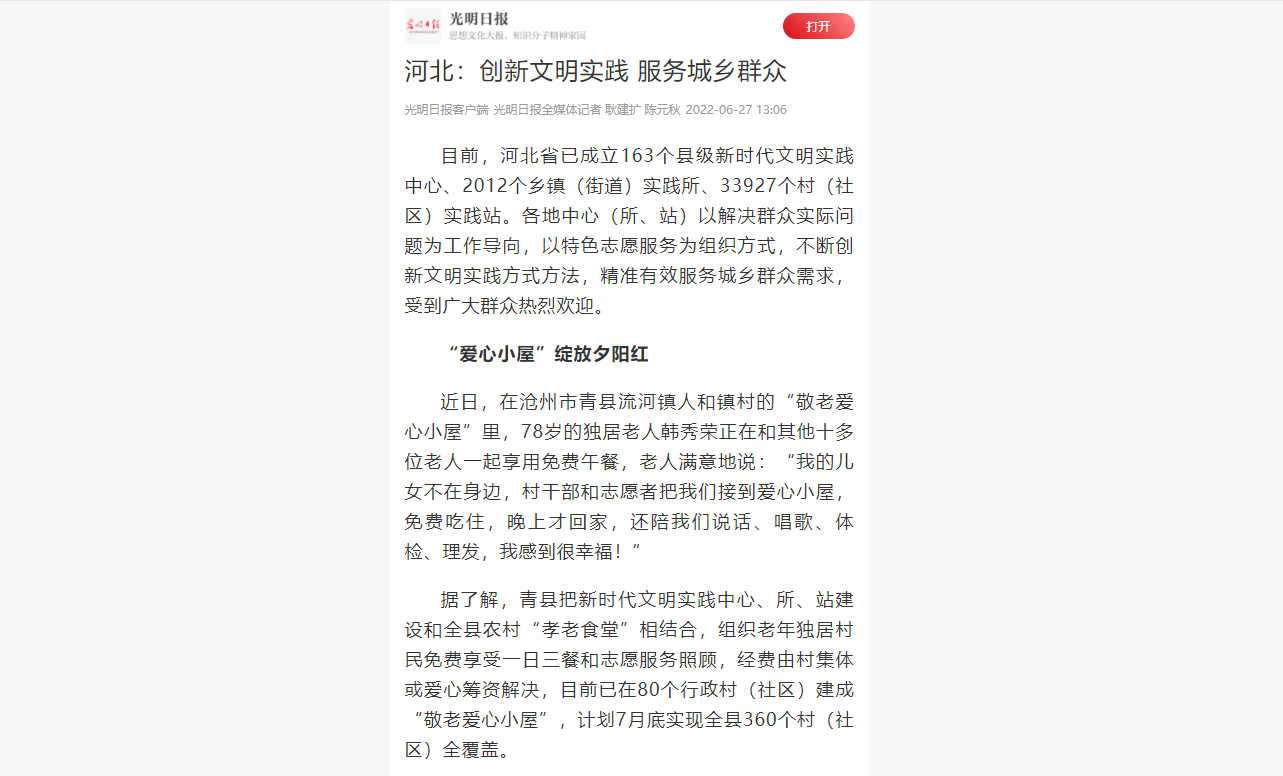 6月29日,《光明日报》刊登《河北:创新文明实践 服务城乡群众》一文,宣传介绍365官网开展文明实践志愿服务典型事迹。