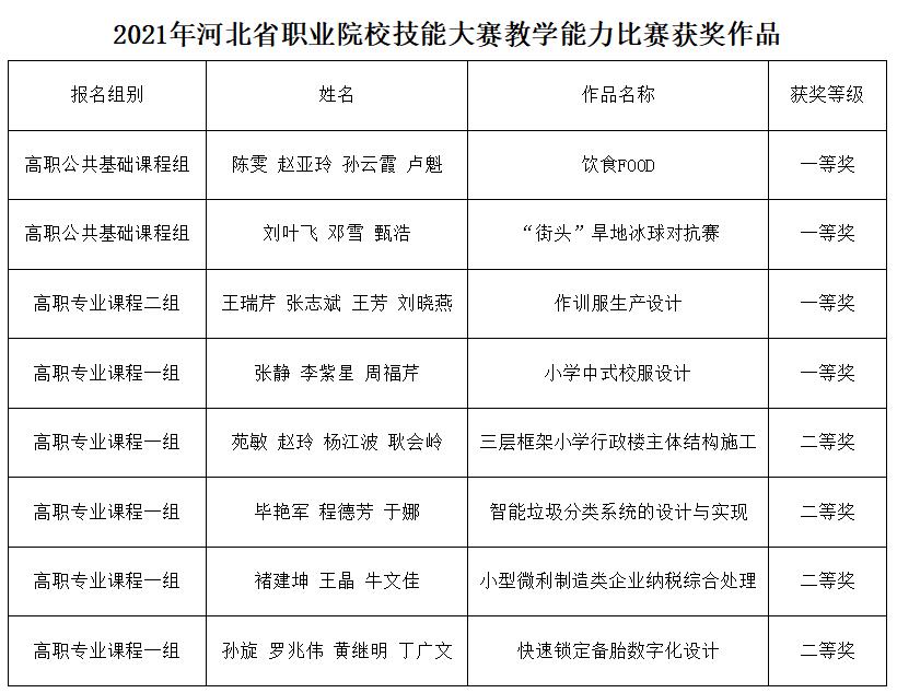 据悉,11月23日,河北省教育厅公布2021年河北省职业院校技能大赛教学能力比赛结果。365官网参赛的8个团队全部获奖,其中《饮食FOOD》、《“街头”旱地冰球对抗赛》、《作训服生产设计》、《小学中式校服设计》4个作品获得省赛一等奖,《智能垃圾分类系统的设计与实现》、《快速锁定备胎数字化设计》、《小型微利制造类企业纳税综合处理》、《三层框架小学行政楼主体结构施工》4个作品获得省赛二等奖。