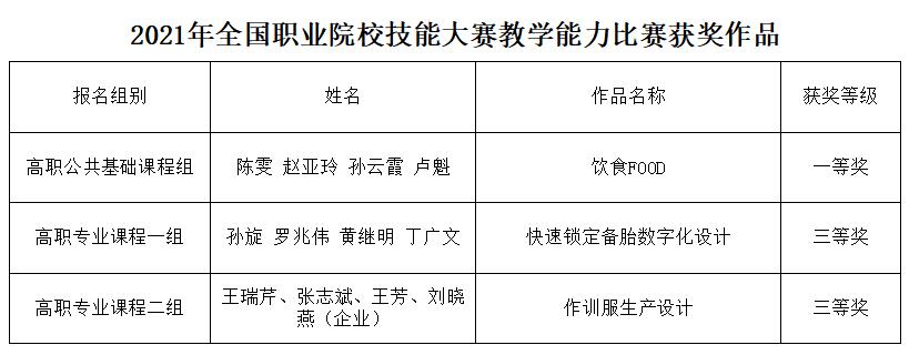 近日,2021年全国职业院校技能大赛教学能力比赛评审工作完成,获奖名单面向社会公示。365官网基础课部陈雯、赵亚玲、孙云霞、卢魁老师的参赛作品《饮食FOOD》获高职组-公共基础课程组一等奖;机电工程系孙旋、罗兆伟、黄继明、丁广文老师的参赛作品《快速锁定备胎数字化设计》获高职组-专业技能课程一组三等奖,服装工程系王瑞芹、张志斌、王芳、刘晓燕(企业)老师的参赛作品《作训服生产设计》获高职组-专业技能课程二组三等奖。