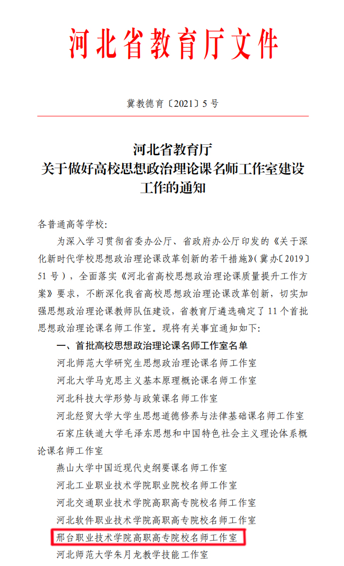 3月29日,河北省教育厅发布《关于高校思想政治理论课名师工作室建设工作的通知》(冀教德育〔2021〕5号),我院申报的“邢台职业技术学院高职高专院校名师工作室”入选,这是河北省首批、我院首个思想政治理论课名师工作室。