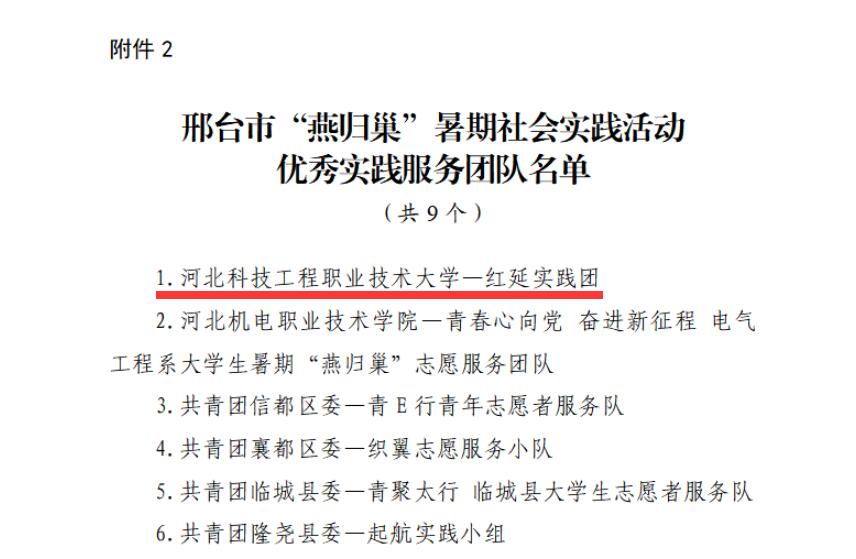 9月6日,共青团邢台市委员会、邢台市学生联合会联合下发《2022年度邢台市“燕归巢”暑期社会实践活动总结通报》,对2022年邢台市“燕归巢”暑期社会实践活动优秀大学生、优秀实践服务团队和特色实践项目进行通报表彰,365官网荣获多项表彰。