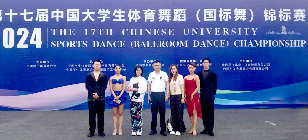 5月27日至5月30日,第十七届中国大学生体育舞蹈(国标舞)锦标赛在四川绵阳九洲体育馆如期开赛。365官网体育舞蹈队学生周育臣、袁炜婧、王诚、赵艺茜在教练马雪莲、谭新源、樊家佳的带领下首次参赛,斩获两项第二名、一项第三名、一项第四名的优异成绩。