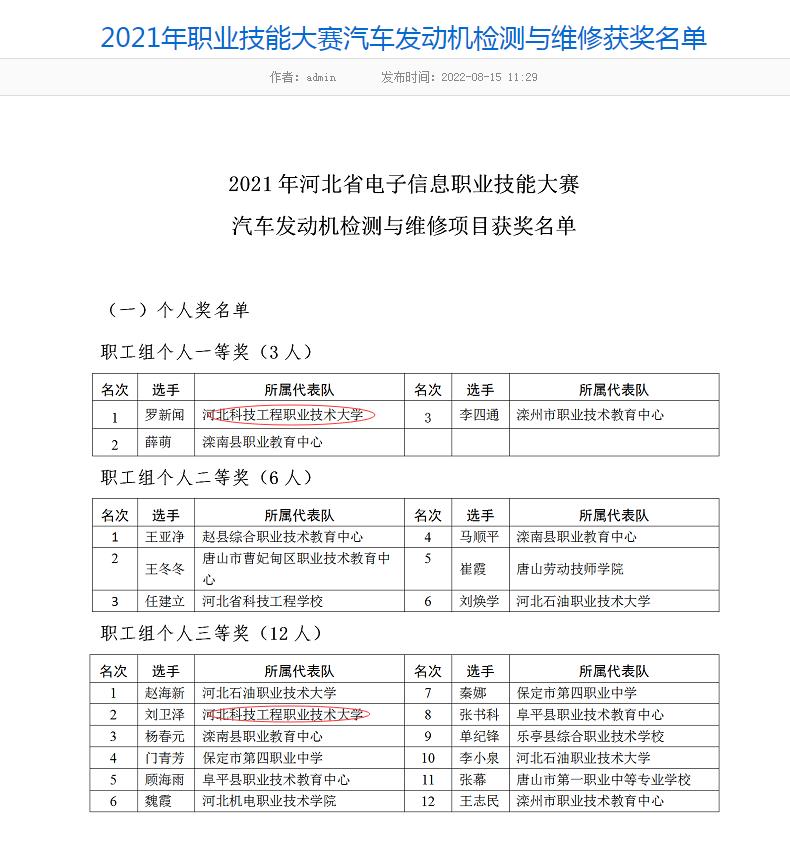 8月11-12日,“畅洋·车拉夫杯”2021年中国技能大赛--河北省电子信息职业技能大赛汽车发动机检测与维修项目比赛在滦南县职业教育中心成功举办并圆满落幕。经过激烈比拼365官网教师罗新闻获得教师组第一名的好成绩,荣获个人一等奖,并获得河北省技术能手荣誉称号;刘卫泽老师荣获个人三等奖;罗新闻、刘卫泽、霍志毅团队获得团体二等奖。