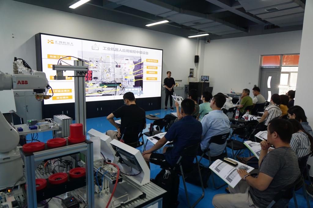 为高质量完成本次培训工作,我院联合北京赛育达科教有限责任公司承办此项培训,江苏汇博机器人技术股份有限公司为本次培训提供技术支持。我院是北京赛育达科教有限责任公司授权的“1+X”证书制度试点工业机器人应用编程职业技能等级证书考核管理中心。培训班教学团队均由赛育达选派的专家、工程师和讲师组成,采取项目化、理实一体化教学模式,采取专家报告的方式对国家职教政策及国家“1+X”证书制度和政策标准进行解读,采取集中讲授方式对工业机器人应用编程理论进行讲解,采取分组现场编程的方式在实训平台上操作。