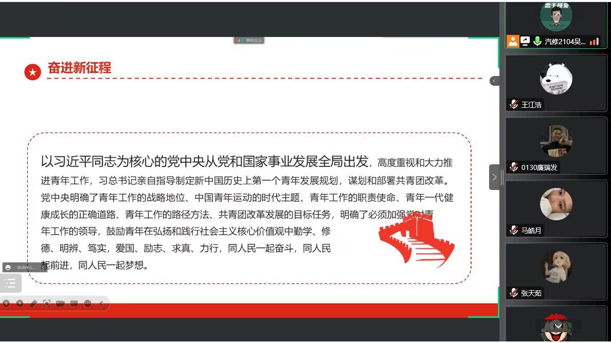 为深入学习贯彻落实党的二十大精神,引导青年团员统一思想,提高政治理论素养。汽车工程系于11月22日组织开展以“奋斗正当时,青春献礼二十大”为主题的团日活动。此次活动于线上进行,全系优秀共青团员参与活动。