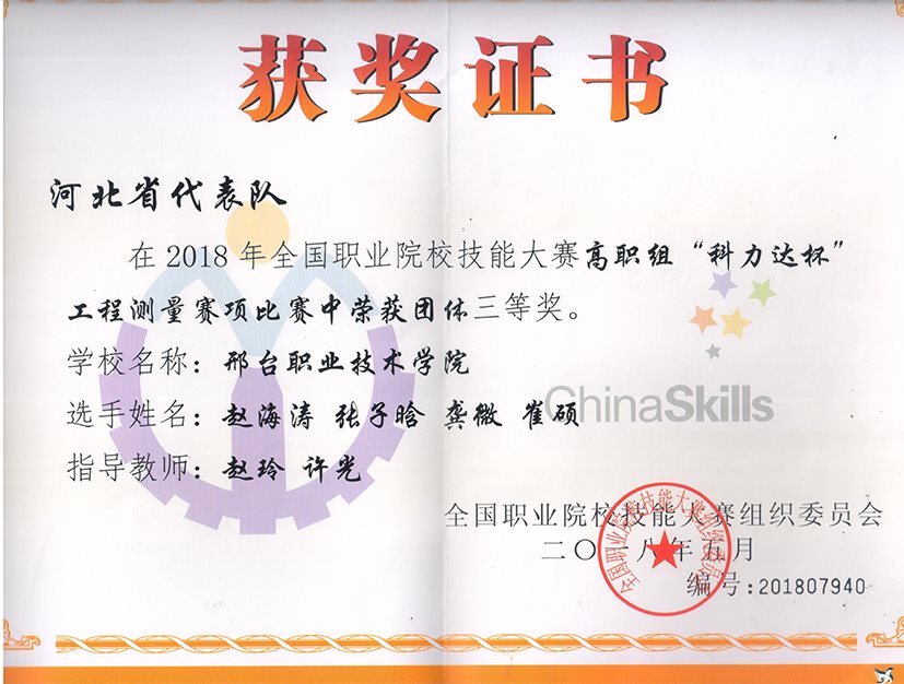 5月26日至27日,2018年全国职业院校技能大赛高职组“科力达”杯测绘赛项比赛在昆明冶金高等专科学校安宁校区举行,来自全国31个省、直辖市和自治区82所职业院校的五百余名师生参加了比赛。我院建筑工程系建筑工程技术专业代表队,获得全国职业院校技能大赛高职组“科力达”杯测绘赛项比赛团体三等奖。