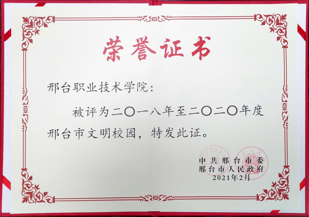 3月3日,邢台文明网刊登2018-2020年度邢台市级文明村镇、文明单位、文明家庭、文明校园名单(共1287个),我院再次被授予市级文明校园荣誉称号,这是我院广大师生共同努力的结果,也是对我院精神文明建设工作的充分肯定和极大鼓励。