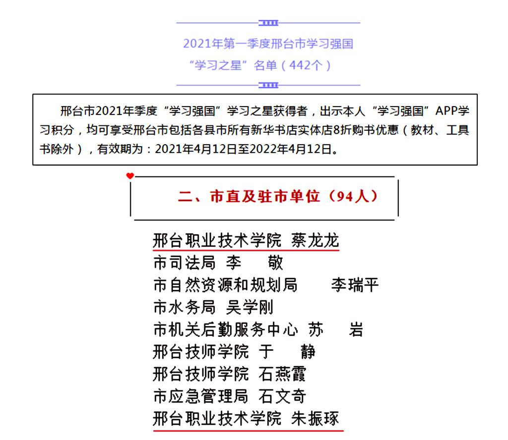 4月12日,邢台市委宣传部对全市“学习强国”学习平台推广使用工作学习之星进行通报。经各地各单位逐级推荐、业务部门审核把关,我院蔡龙龙、朱振琢两名教师被授予2021年第一季度学习强国“学习之星”。