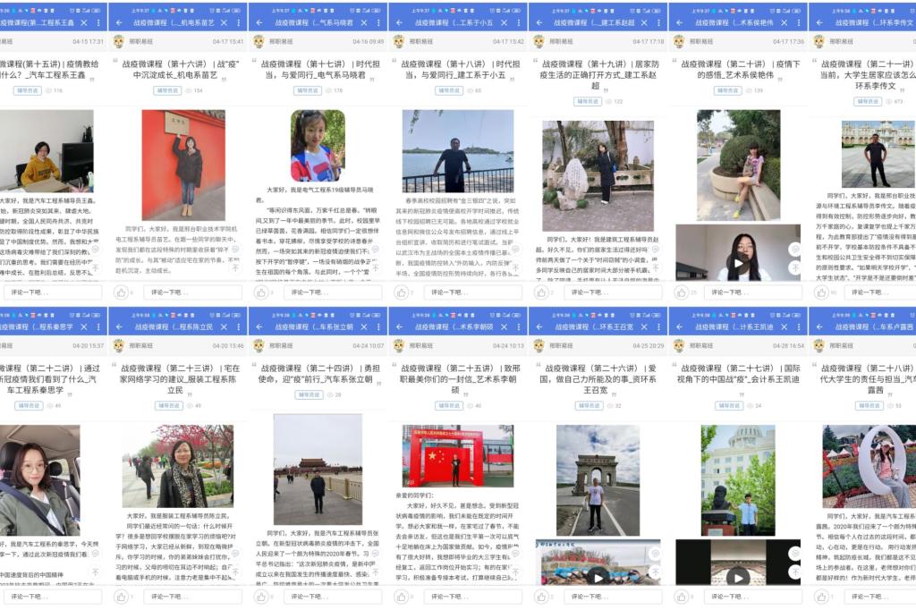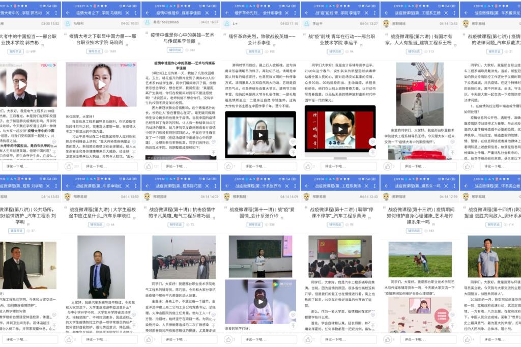 思政微课程主要围绕爱国主义教育、生命教育、社会责任感教育、规则教育、爱与感恩教育等主题,采取图文、微视频、录播等多种方式进行授课,每日进行更新。截至5月6日,战“疫”思政微课专栏共推出28讲内容,集中展示了我院辅导员讲述的《疫情大考中的“中国担当”》《抗击疫情中的平凡英雄》《疫情期间如何维护自己心理健康》《疫情防控下半场,高校辅导员如何做好大学生稳就业工作》《聊聊“停课不停学”》等。丰富深刻的育人内容、喜闻乐见的授课形式深受同学们的喜爱和欢迎。