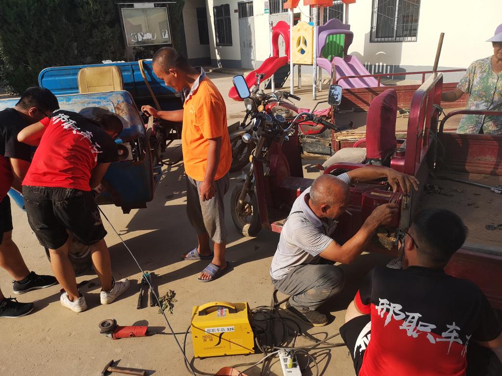 小分队由系专业学习标兵贾明轩、杨志明、郑朝、邢帅杰等同学组成,他们不畏酷暑,在系团总支书记杜磊老师的带领下来到邢台县会宁镇北良舍村,运用自身的专业技能,义务对农民家中存在问题的农用机械、劳作工具进行了维修养护,并向老乡们耐心细致地讲解机械科学的使用和养护方法,宣传国家惠农政策。