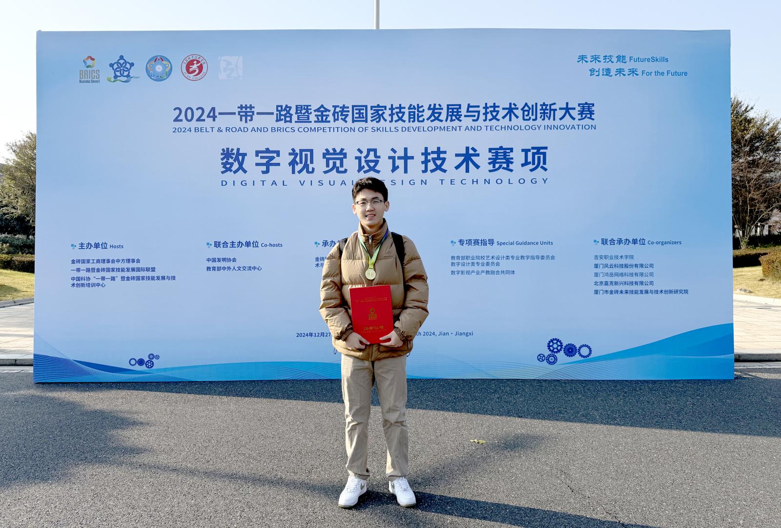 12月29日,由金砖国家技能发展与技术创新大赛组委会及一带一路暨金砖国家技能发展国际联盟(金砖赛组委会)主办的2024年一带一路暨金砖国家技能发展与技术创新大赛之数字视觉设计技术赛项国内总决赛(高职组)在吉安职业技术学院圆满落幕。365官网艺术与传媒系视觉传达设计专业孟佳树同学表现卓越,总成绩位居第三,一举斩获一等奖夺得金牌。