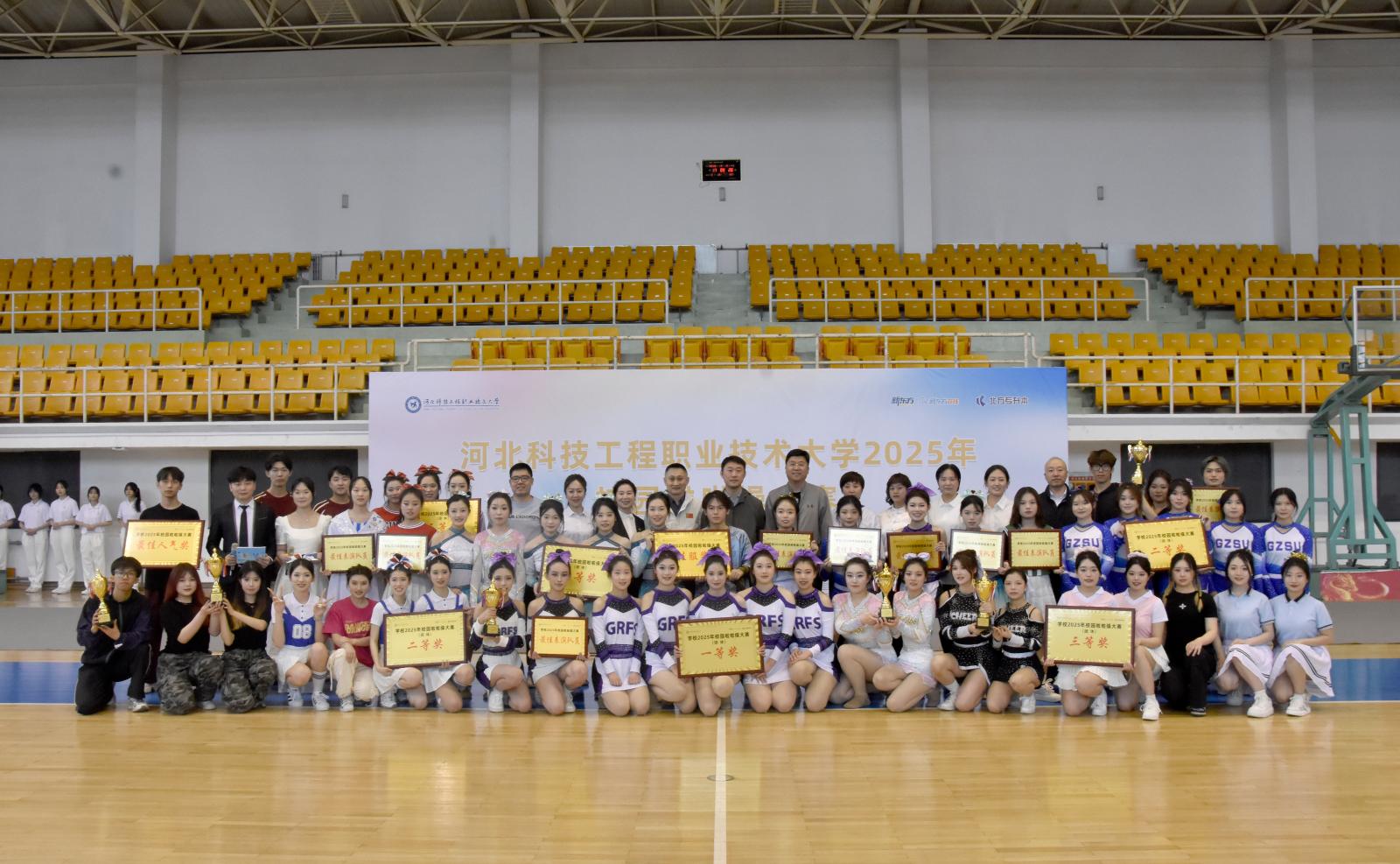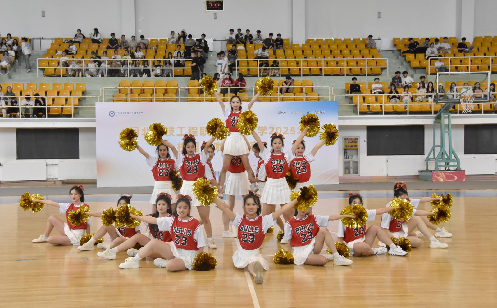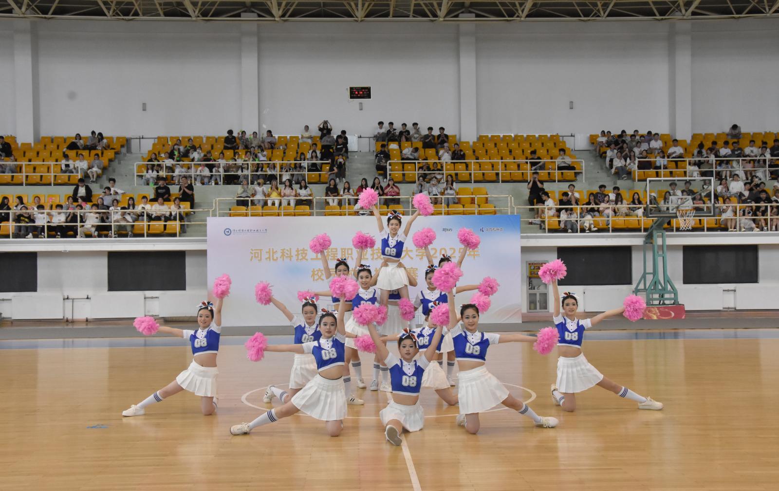 4月16日下午,伴随着青春激昂的开场舞《歌唱祖国》,学校2025年校园啦啦操大赛在东校区体育馆拉开帷幕,千余名师生通过“线上直播+线下助威”方式观看比赛。