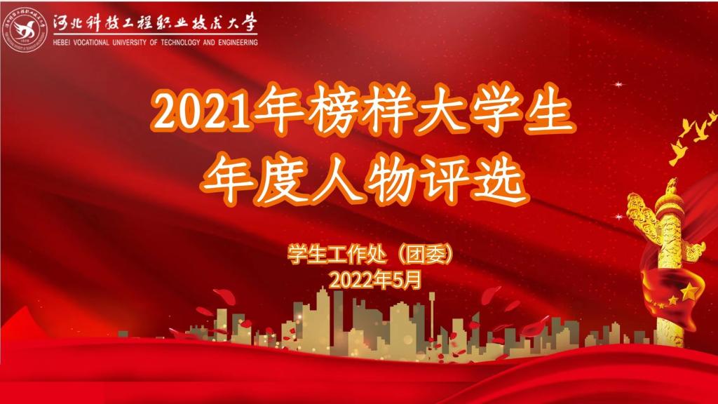 评选活动于2022年初启动,面向全校学生寻访在社会实践、学术科研、创新创业、自强不息、见义勇为、孝老爱亲、全面发展、多才多艺等方面具有突出成绩或感动他人的事迹,经过逐级寻访、系部推荐、学校综合评审、公示等环节,最终机电系王树生、艺术与传媒系付宗烨、建筑工程系李论、资源与环境工程系张齐星、机电工程系王宝成五位同学获得2021年科工大榜样大学生年度人物奖;建筑工程系贾泽彬、艺术与传媒系李冰、服装工程系孔慧慧、信息工程系王佳祺、电气工程系阳光五位同学获得2021科工大榜样大学生年度人物提名奖。