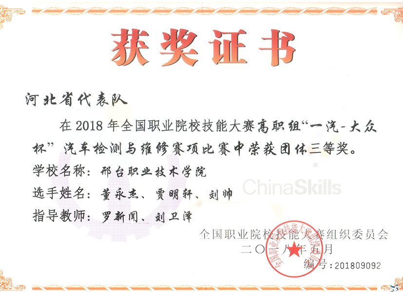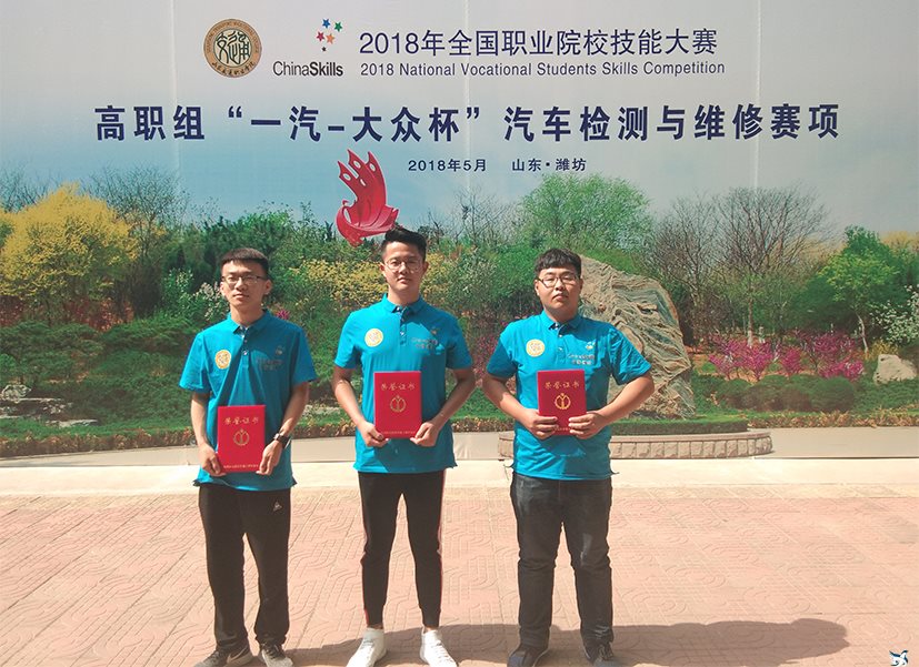 5月25日至26日,2018年全国职业院校技能大赛高职组(一汽-大众杯)汽车检测与维修赛项在山东潍坊举行。大赛共有来自全国31个省市自治区的60支参赛队伍参赛。我院参赛选手董永杰、贾明轩、刘帅三位同学在指导教师罗新闻、刘卫泽的精心指导下,沉着应战,发挥了较高的专业技能水平,凭借扎实的知识基础与良好的专业素养在竞赛中脱颖而出,最终荣获团体三等奖。