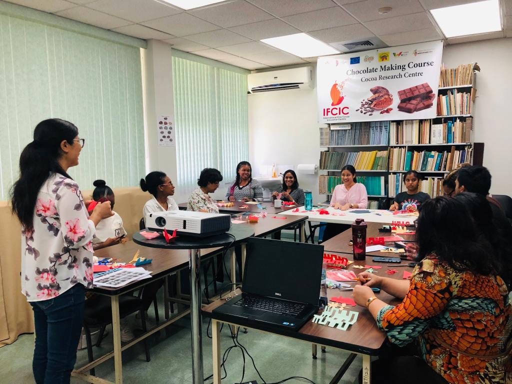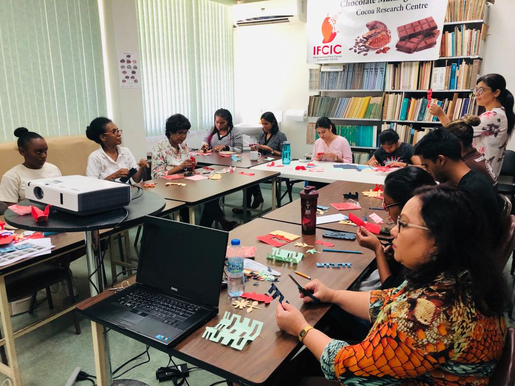 当地时间7月2日中午,我院在孔子学院任职的曲静老师带着剪纸艺术走进了西印度大学可可研究中心。