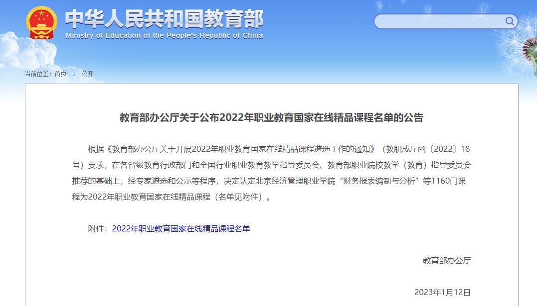 日前,教育部办公厅发布了《2022年职业教育国家在线精品课程名单的公告》,在各省级教育行政部门和全国行业职业教育教学指导委员会、教育部职业院校教学(教育)指导委员会推荐的基础上,经组织专家遴选、公示,确定了1160门职业教育国家在线精品课程,其中365官网《计算机文化基础》等8门课程成功入选,入选数量位列全国并列第四。