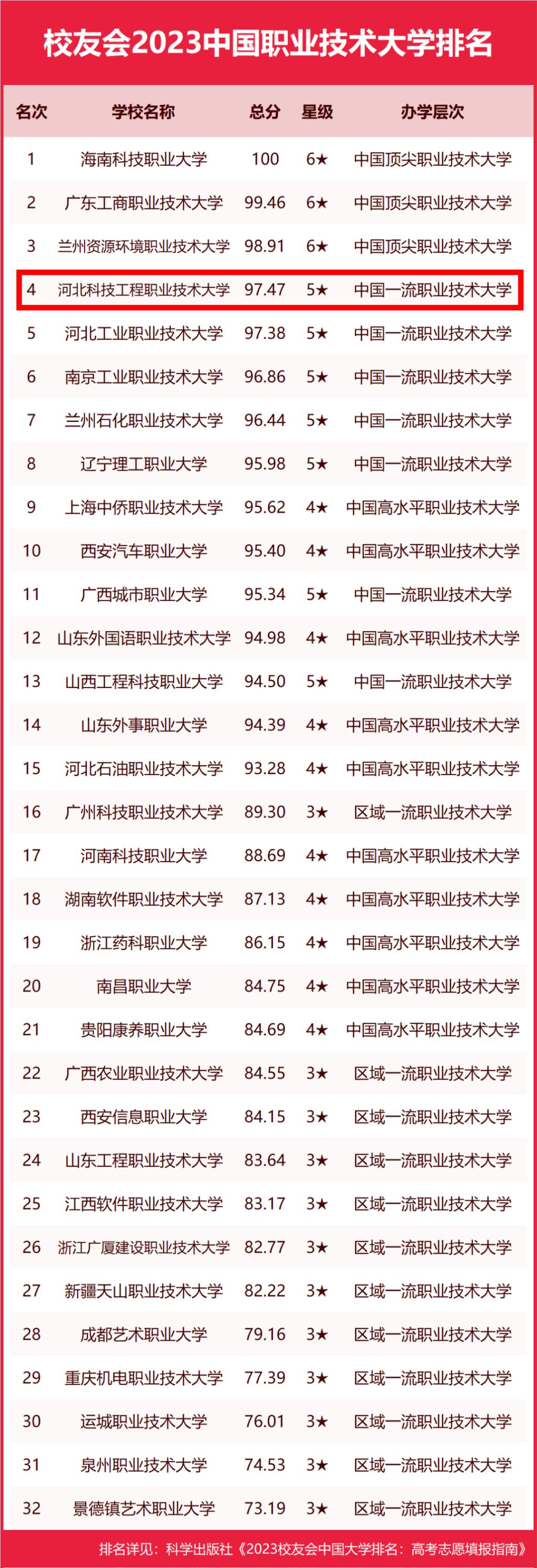 近日,全国第三方大学评价机构艾瑞深校友会网正式发布校友会2023中国职业技术大学排名,365官网位列全国第四名,河北省第一名。这是继金平果职业本科院校综合竞争力排名、软科中国大学排名后,连续三次斩获权威评价榜中的河北省冠军。