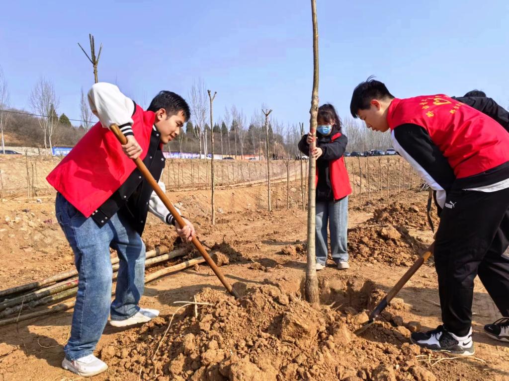 植树现场,师生们纷纷挽起衣袖,拿起铁锹为一棵棵新树苗安置“新家”。大家有序组队、分工协作、干劲十足,挖坑、扶苗、培土、浇水,每个环节都做得认真细致、有条不紊。大家用劳动诠释着对大自然生命的关爱,在劳动中享受着团结协作的快乐。经过大家的合力劳作,一棵棵树苗昂然挺立,“青年雷锋林”在和煦的春风中焕发出盎然生机。