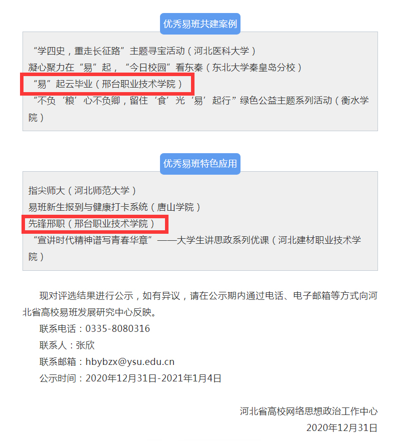 近期,河北省高校网络思想政治工作中心公布了2020年度易班共建高校优秀评选表彰名单,学院报送的“易”起云毕业案例、先锋邢职在线答题应用分别荣获优秀易班共建案例、优秀易班特色应用。