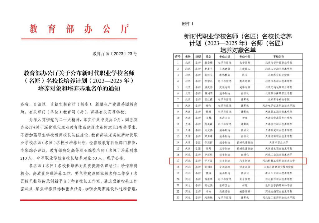 据悉,此次教育部共确定高等职业院校名师(名匠)培养对象210人,其中河北省8人。教育部自今年七月份启动了新时代职业学校名师(名匠)名校长培养计划(以下简称职教“三名”计划),计划每年遴选一批中等职业学校校长和高等职业院校(含本科层次和专科层次)从事一线教育教学的在职在岗骨干教师或具有绝招绝技的技能大师,进行为期三年的集中培养。职教“三名”计划从2023年开始实施,每年压茬推进,旨在培养打造一批理想信念坚定、师德高尚、教育教学能力和专业实践能力突出的双师型名师(名匠),一批办学理念先进、办学定位准确、勇于开拓创新、精通现代职业学校治理的教育家型名校长。