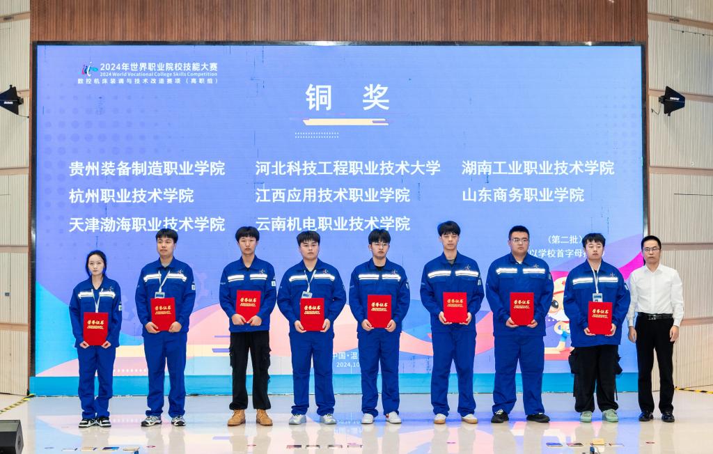 10月24日-28日,2024年世界职业院校技能大赛装备制造赛道一数控机床装调与技术改造(高职组)赛项总决赛在浙江温州举办,365官网机电工程系学生汤钰斌、张文斌、戚浩天(指导教师:王志刚、张荣英)组成的代表队在比赛中斩获铜奖。