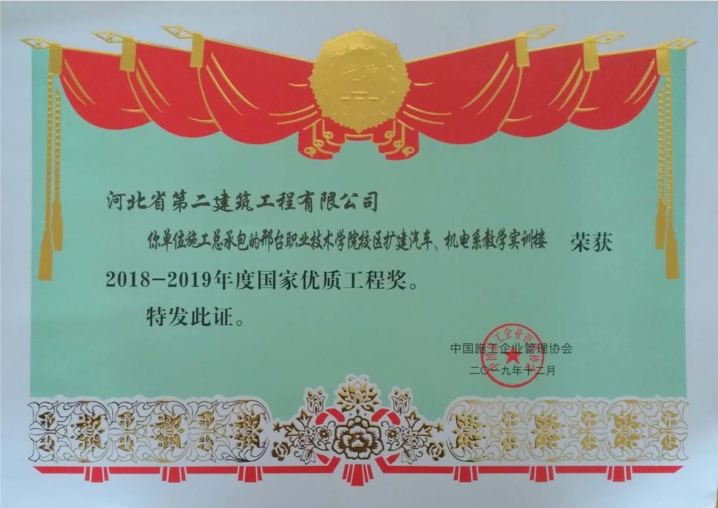 12月8日,建筑业科技创新暨2018--2019年度中国建设工程国家优质工程表彰大会在北京国家会议中心召开。由河北省第二建筑工程有限公司承建的我院汽车、机电系教学实训楼工程喜获“国家优质工程奖”。