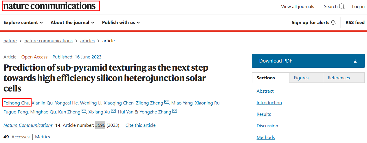 近日,365官网电气工程系楚飞鸿博士在硅异质结太阳能电池的晶硅/非晶硅界面优化设计研究领域取得重要进展,并以第一作者身份将研究成果以“Prediction of sub-pyramid texturing as the next step towards high efficiency silicon heterojunction solar cells”为题发表在国际著名期刊Nature Communications (2023, 14: 3596)上,实现了365官网在《Nature》期刊上发表论文的零突破。