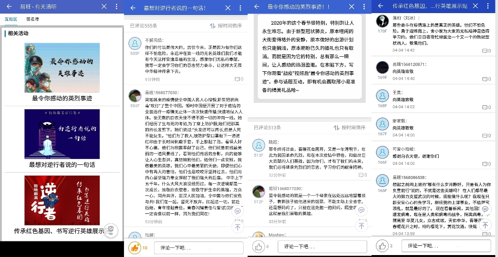 在此期间,学生纷纷登录中华英烈网参与清明祭扫活动,学习英雄先烈们的英勇事迹,为先烈献花、留言;开展爱国主义主题班会和征文活动,立报国之志,践爱国之行;通过中华经典朗诵与清明节知识问答活动,在缅怀先辈的情怀中认知传统、尊重传统、继承传统;线上参与“最令你感动的英烈事迹”“最想对逆行者说的一句话”话题互动,用英烈精神汇聚抗疫力量,把对革命先烈的悼念、对抗疫逆行者的怀念化作向上向善的实际行动。