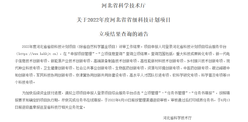近日,河北省科技厅公布了2022年度河北省省级科技计划项目立项结果,365官网共有3个项目获批立项,获批项目经费共计50万元。