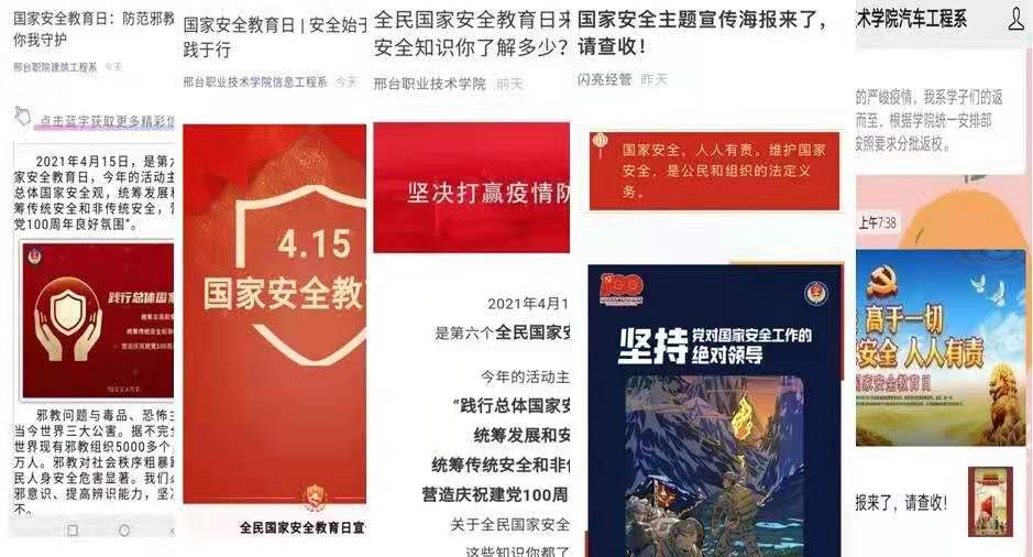 校园内充分利用官网、官微、条幅、海报、展板、电子屏等线上线下载体,推送展示国家安全知识等相关内容,多角度、立体式宣传国家安全教育。各级党团学组织发挥自身优势,运用主题党团日、主题班会、海报作品征集等多种形式,开展了题材广泛、内容丰富的宣传教育活动,深受广大师生欢迎。