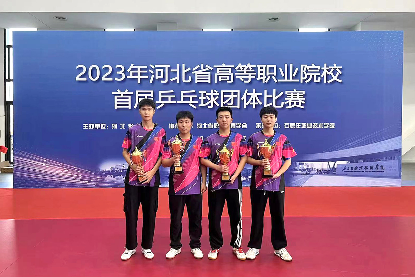 11月29日至12月2日,河北省高等职业院校首届乒乓球团体比赛在石家庄职业技术学院(正定校区)举办。本次比赛共有来自全省20所高校31支代表队120余名学生运动员参加,365官网派出4名学生组成的男子乒乓球队参加比赛,并斩获男子团体第二名,这是365官网乒乓球队历史性的突破