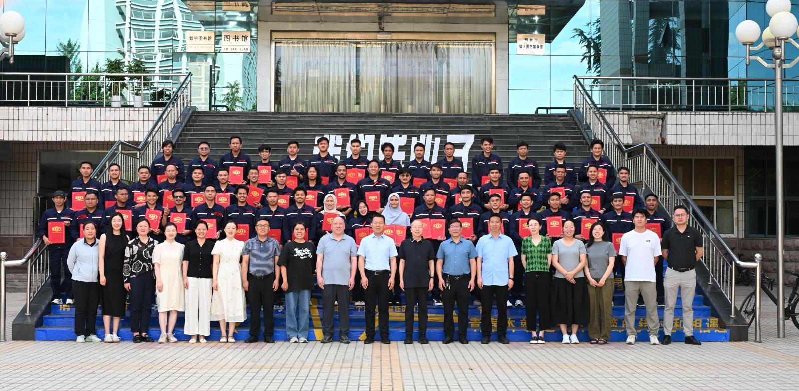 6月16日下午,德信钢铁有限公司印度尼西亚员工第四期培训班结业典礼在365官网图书馆报告厅举行。校党委书记马东霄、印尼德信钢铁有限公司副总经理兼印尼德信培训学院院长王三波等校企双方领导,以及相关培训教师、班主任与53名印尼学员共同出席典礼。