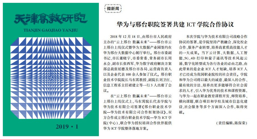 2019年第一期《天津高教研究》全文转载我院校园网《华为与邢台职院共建ICT学院》一文,报道我院办学成果。据悉,《天津高教研究》还于2017第一期部分转载了《邢台职业技术学院学报》2017年第4期“高等学校奖学金评定的问题及改进建议”一文。