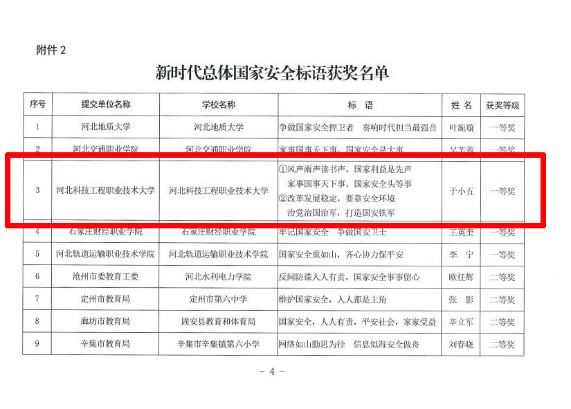 今年是习近平总书记提出总体国家安全观10周年。为深入展示新时代国家安全事业发展新气象,进一步增强全民国家安全意识和素养,丰富拓展国家安全宣传素材,办好第九个“4·15”全民国家安全教育日宣传教育活动,河北省教育厅开展新时代总体国家安全标语和安全随手拍图片征集大赛。365官网积极响应,踊跃报名参赛。经评审,于小五老师的两件参赛标语作品“风声雨声读书声,国家利益是先声;家事国事天下事,国家安全头等事。”“改革发展稳定,要靠安全环境;治党治国治军,打造国安铁军。”荣获一等奖。