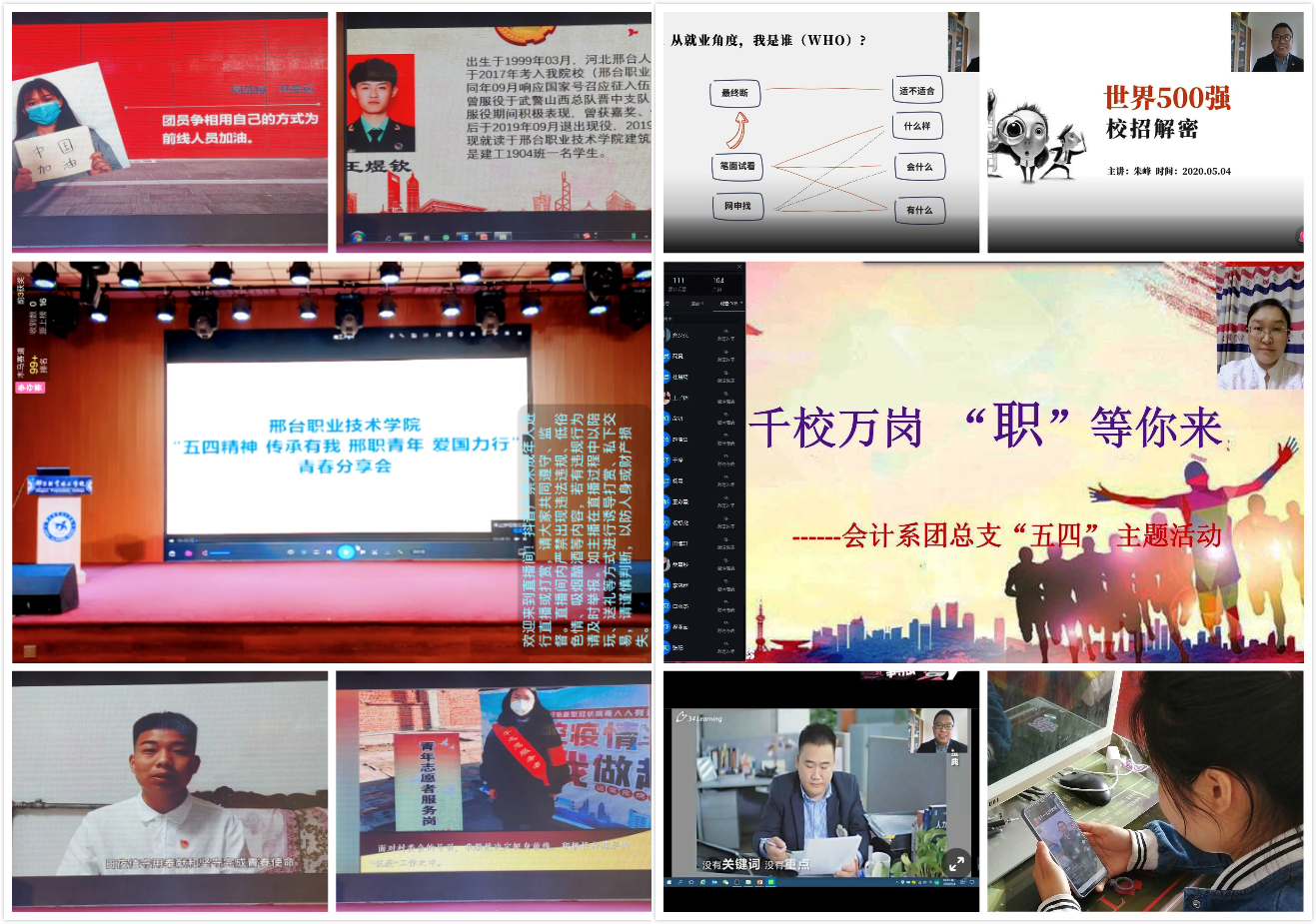 4月27日起,在全院范围内开展“我们都是收信人”“五四精神·传承有我”网络主题“云接力”活动。邢职学子纷纷积极响应,通过海报、微视频、H5小程序等形式以最青春的姿态献礼五四,传承五四精神。4月28日起,学院开展“五四精神 传承有我 邢职青年 爱国力行”青春故事“云分享”活动。从全校457位战疫志愿者中遴选分享人讲述他们的战“疫”故事和感想感悟,精彩的分享赢得阵阵“云掌声”。4月28日起,学院各级团组织云搭建青年就业信息服务平台,汇集招聘信息、就业政策、最新资讯、就业服务活动等内容,与建档立卡学生在线“云座谈”,提供无微不至的云服务。5月4日,全院团员青年相聚“云团课”,云在线观看由学院团委书记李磊主讲的“战疫情,奏响新时代的青春之歌”主题团课,共同聆听与青春使命有关的邢职故事,见证“邢职精神”的动人篇章。
