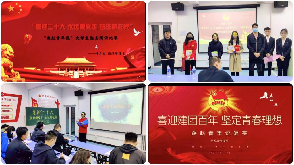 为迎接党的二十大胜利召开、庆祝中国共产主义青年团成立100周年,引导青年学生深刻感悟新时代党和国家事业发展的伟大成就和党领导中国青年运动的光辉历程,根据河北省第四届“燕赵青年说”大学生励志演讲比赛的要求,自3月1日起,学校举办了“喜迎二十大 永远跟党走 奋进新征程”“燕赵青年说”大学生励志演讲比赛。