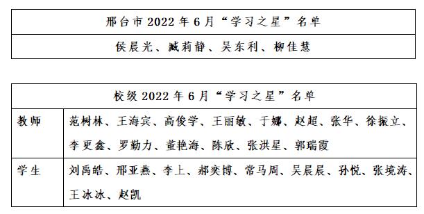 “学习强国”学习平台是中宣部主办的立足全党、面向全社会的科学理论学习阵地和思想文化聚合平台。经各地各单位逐级推荐、业务部门审核把关,侯晨光等四名学员被邢台市授予2022年6月“学习之星”荣誉称号。同时,学校为进一步抓好“学习强国”学习平台推广工作,激发广大师生学习积极性,决定授予范树林等二十四名学员2022年6月份校级“学习之星”荣誉称号。