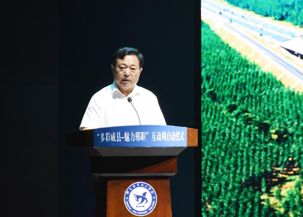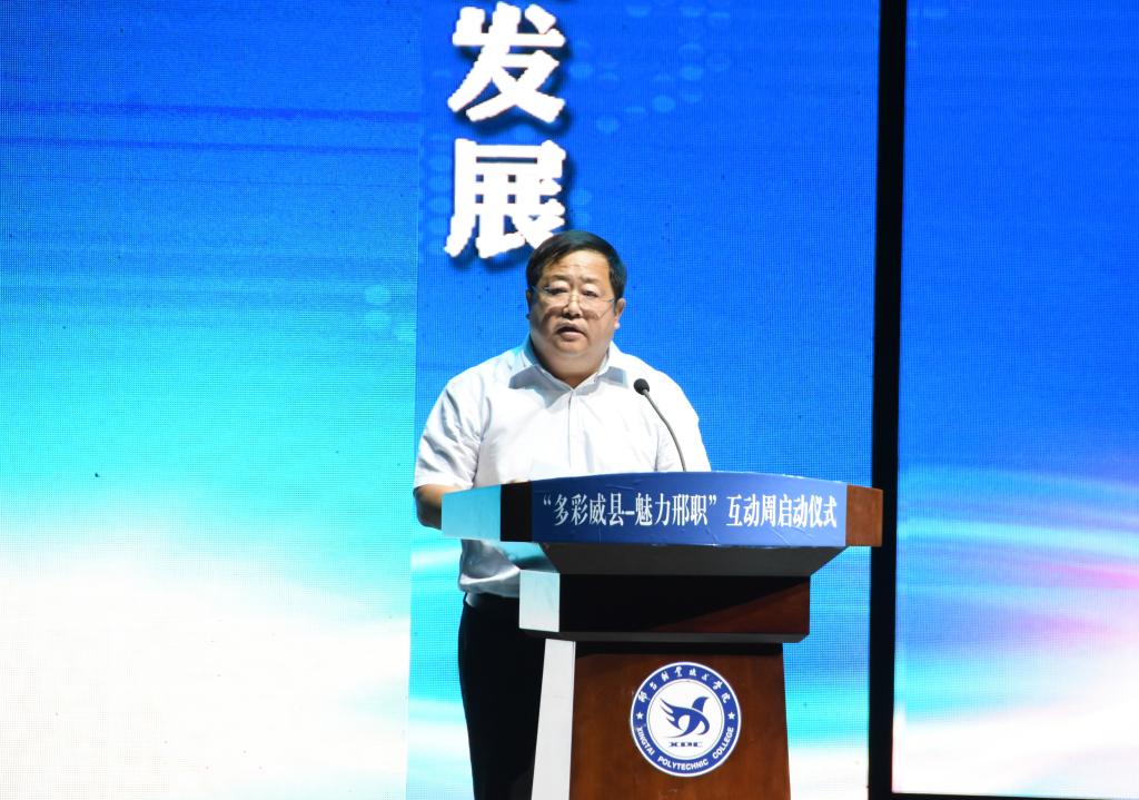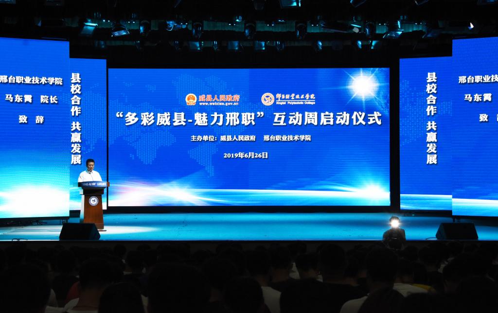 为推进政校企深度合作,进一步服务县域经济发展,6月26日,“多彩威县-魅力邢职”互动周在我院隆重启动。威县县委副书记、县长商黎英,副县长黄清宇、王炳明、孙立坤,我院党委书记刘彩琴、院长马东霄、副院长李贤彬、刘卫红等出席活动。威县发改局等部门负责人、媒体记者以及我院在校师生1000余人现场共同见证互动周的启动。仪式由刘卫红副院长主持。