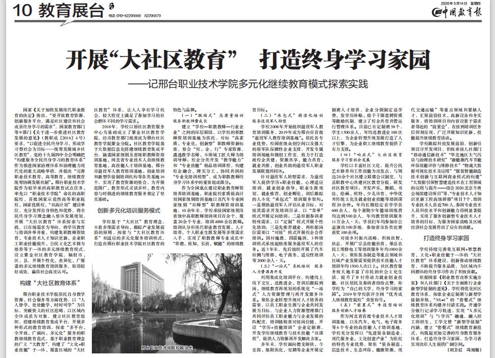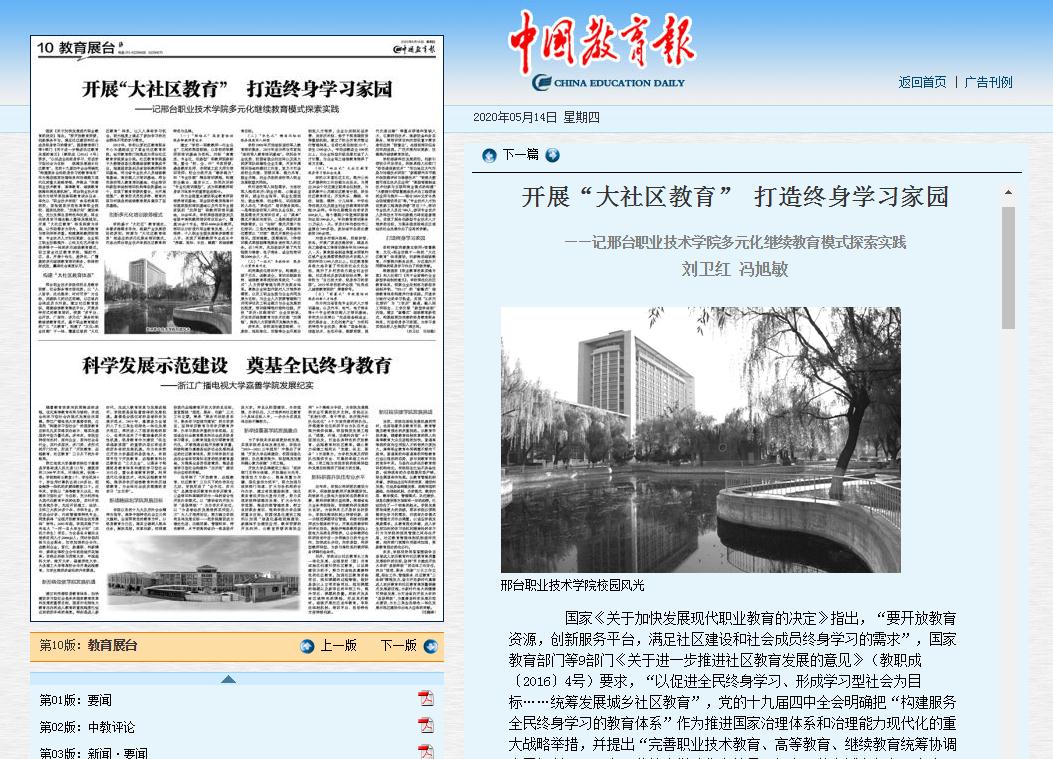 5月14日,《中国教育报》刊登《开展“大社区教育” 打造终身学习家园》一文,宣传介绍我院多元化继续教育模式的探索实践。